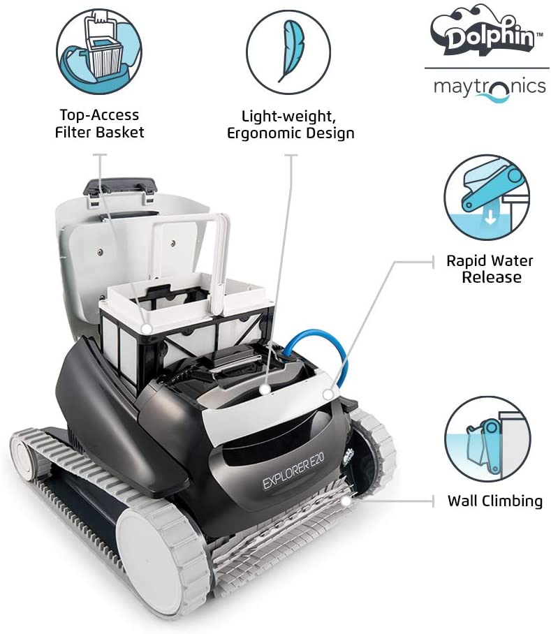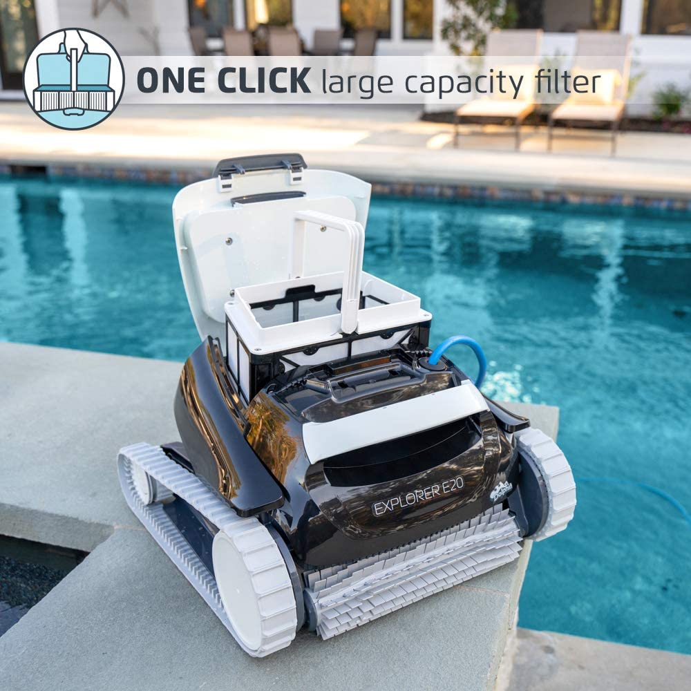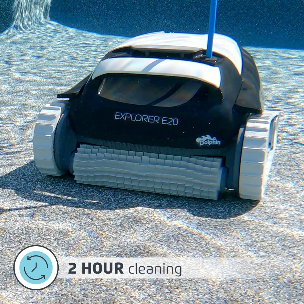 The Dolphin Explorer E20 is the super-efficient solution to a clean pool. This compact yet powerful cleaning machine scrubs the floor and walls, and filters out fine debris leaving your pool sparkling clean.